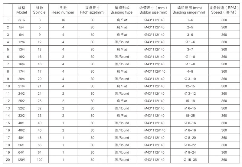 我公司生產(chǎn)的 80 系列高速編織機被廣泛的用于編織各種圓的或者扁的繩帶(鞋帶、手提帶、拖車繩、行李繩、釣魚線、玻纖管、高壓膠管、裝飾繩、松緊帶等)和電線電纜(高溫導線、屏蔽線等)。