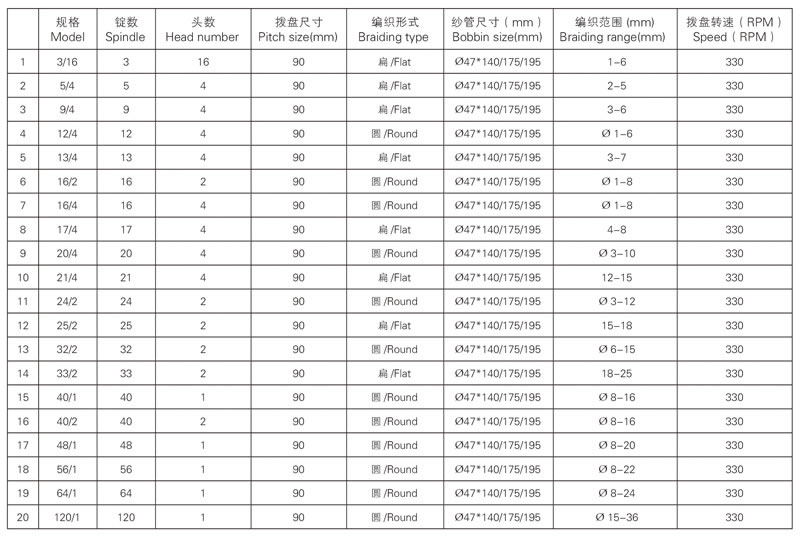 The high speed braiding machine we produce are commonly used to braid many kinds of both round and flat ropes/cords/laces (shoelaces, handbag laces, tow ropes, luggage ropes, fishing line, fiberglass sleeves, high pressure rubber hoses, decoration ropes, aerial ropes, elastic ropes, etc) and cables (high temperature wire, shielded cable, stainless steel wire braided flex hose, etc.)